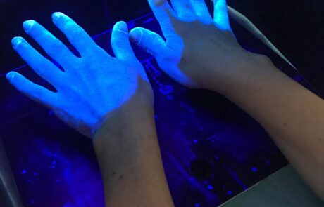 Com o intuito de alertar para a importância da higiene das mãos, os colaboradores do hospital e os utentes, realizaram a avaliação da técnica de higiene das mãos com recurso a máquina de luz negra e a pintura de uma tela com as mãos dos profissionais de saúde.